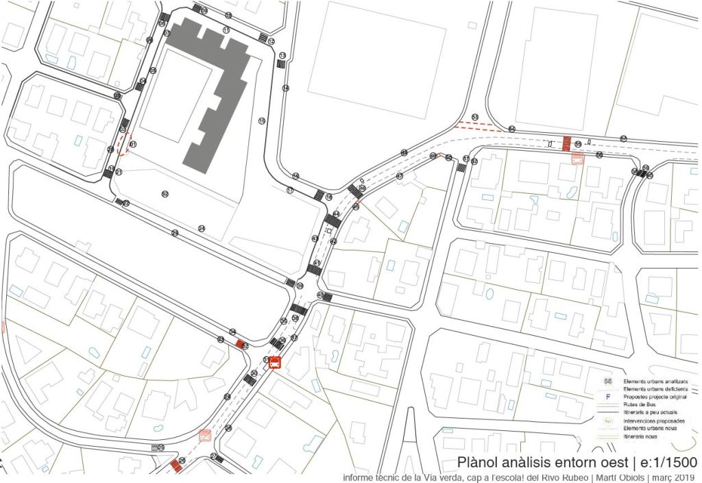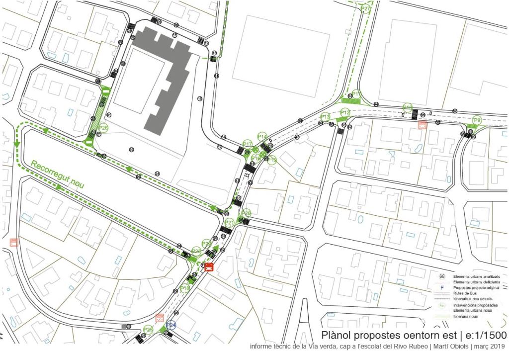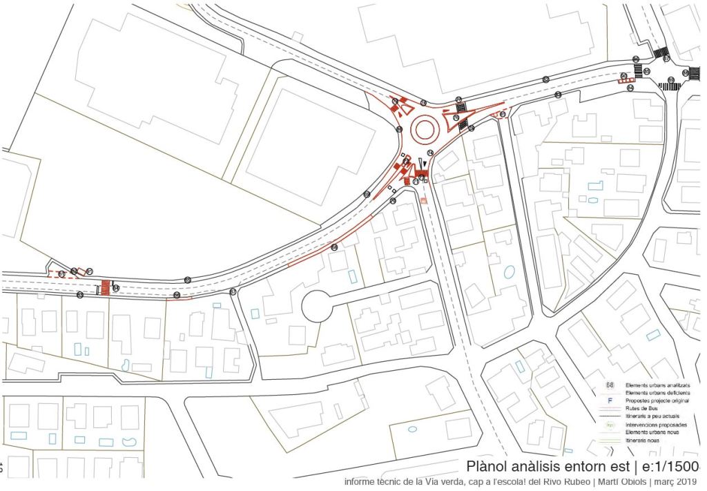 transport sostenibles, o que directament ho impossibilita. El projecte constava de 2 parts: analitzar un estudi previ que ja tenien fet, i una segona part analitzar l’entorn i formes d’accedir a l’escola i proposar-ne millores. L’Ajuntament ja va fer una primera inversió en pintura i senyalèctica a la via pública, però amb diverses mancances. El projecte proposava diverses millores possibles esgraonades amb el temps i segons urgència i pressupost. Però per l’entorn realment té moltes mancances que ni tan sols compleixen amb la normativa vigent bàsica. La proposta de màxims era pacificar de forma dràstica l’avinguda principal que porta fins a Rubí per tal de crear un passeig que convidés a caminar i recorre’l