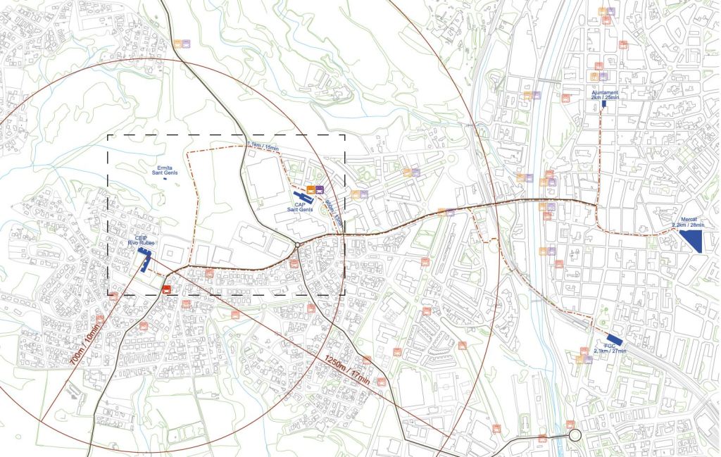i una urbanització residencial als afores de Rubí. Per la seva ubicació i densitat de la zona hi van infants de zones molt diverses, per tant la mobilitat generada per accedir-hi és molt gran i majoritàriament en cotxe. A banda de la distància, també hi ha 2 factors molt importants que provoquen aquesta alta i majoritària mobilitat en vehicle privat. Per una banda, els hàbits de les persones, i per altre que la zona té una urbanització molt bàsica i precària que clarament no incentiven a anar-hi a peu o bicicleta o altres mitjans de