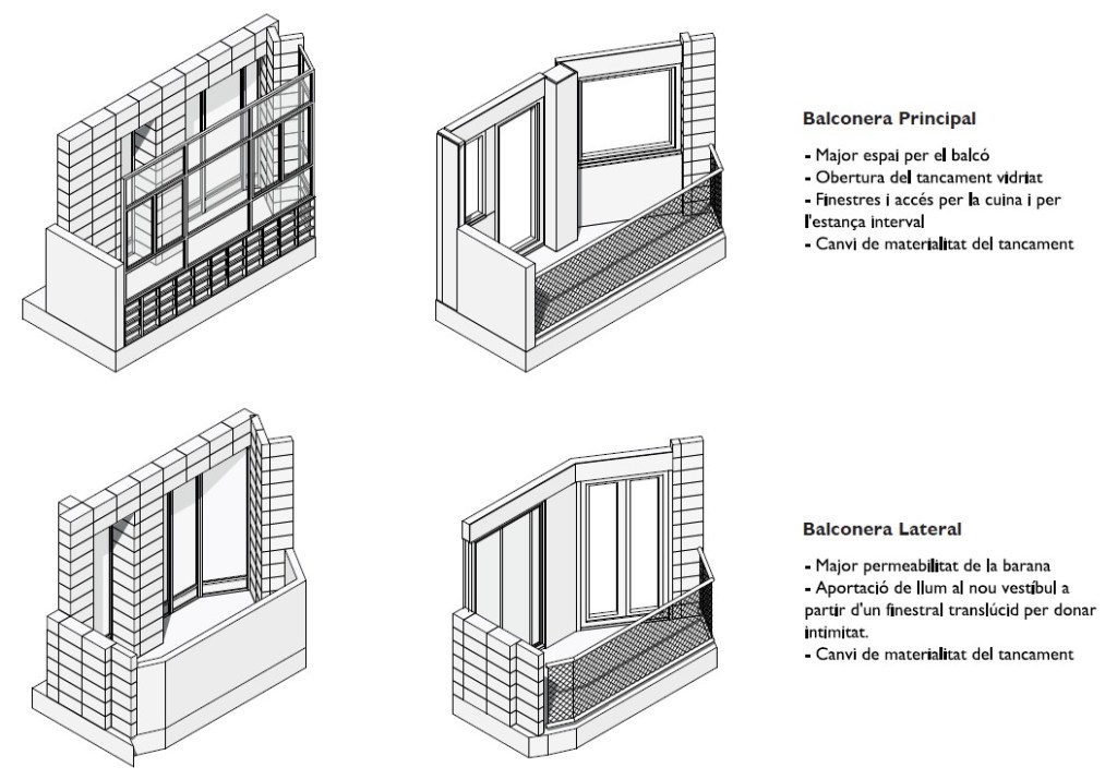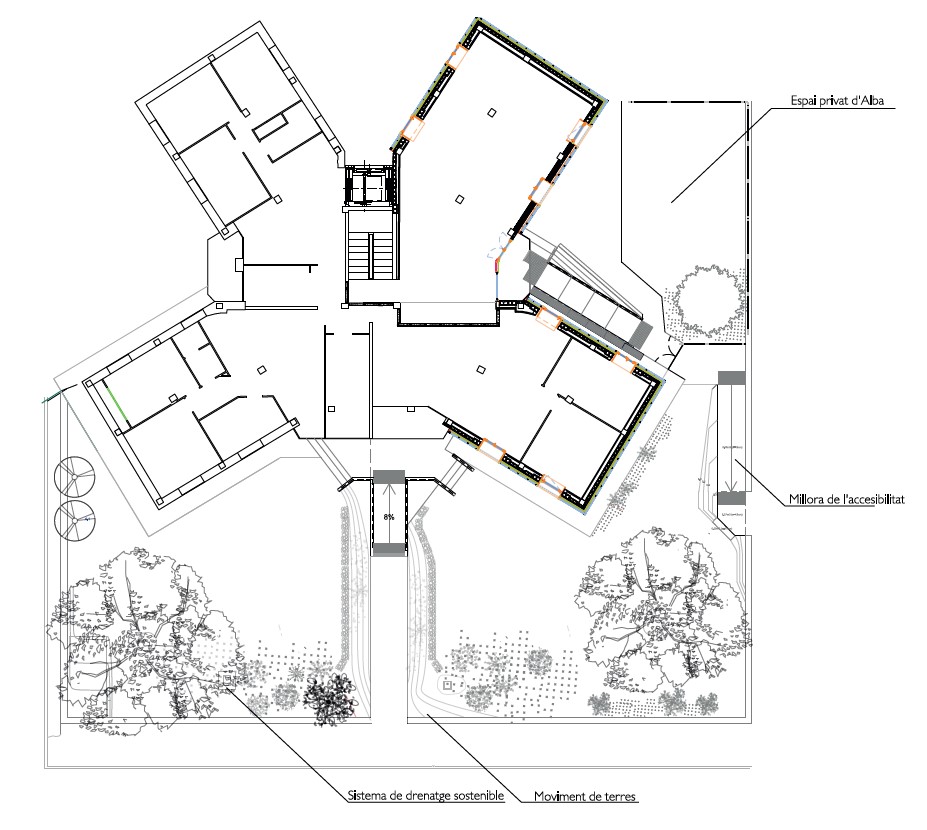 La intervenció es fa amb criteris de sostenibilitat i eficiència energètica. Es millora molt la façana muntant aïllament i un acabat de façana de policarbonat que millora l’estanquitat i permet captació solar, a més a més es renoven totes les finestres per millorar-ne l’estanquitat i aïllament i guanyar uns espais habitables. Finalment, la distribució es basa en agafar de referència l’estructura de pilars per muntar un nucli central servidor d’on neixen els envans i les instal·lacions. Es fan servir radiadors de terra activada, divisòries de fusta reciclada, arrebossats de terra, cotó reciclat… la sostenibilitat és l’eix central. Intencionadament, s’ha volgut deixar el 50% de la superfície sense intervenir per donar llibertat a qui acabi el projecte de seguir el projecte pensat per l’estudiantat, o fer-lo seu i modificar-lo.